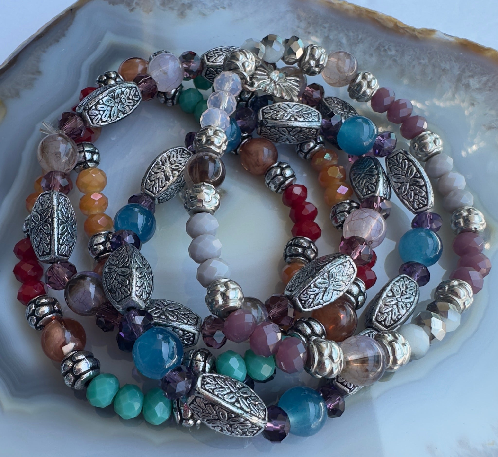 This premium gemstone bracelet collection features five beautifully coordinated bracelets, each adorned with carefully selected semi-precious stones. Perfect for the spiritually minded fashionista who loves to stack bracelets for a personalized, layered look.