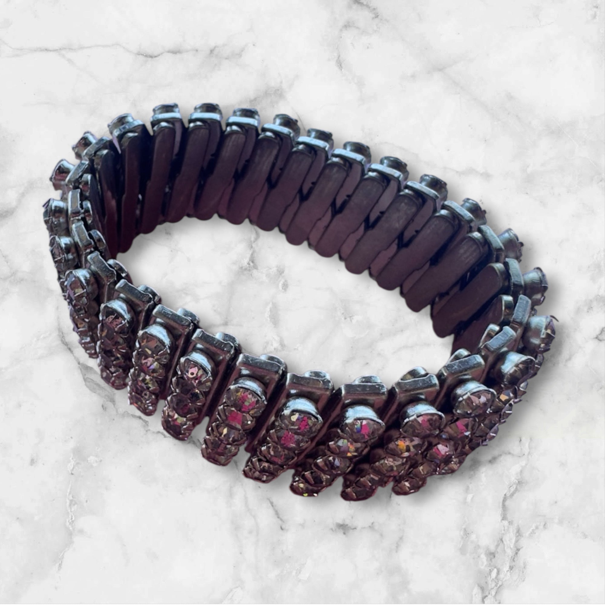 This exquisite rhinestone expansion bracelet features a luxurious display of deep rhinestones crystals set in a classic stretch band design. Perfect for the woman who appreciates vintage jewelry with modern comfort and versatility.